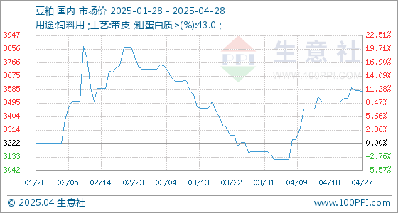4月28日,生意社豆粕基准价为3571.67元/吨,与本月初(3168.00元/吨)相比,上涨了12.74%。