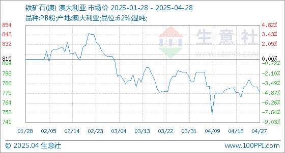 4月28日生意社铁矿石(澳)基准价为777.33元/吨