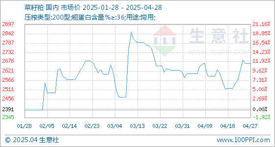 4月28日,生意社菜籽粕基准价为2666.67元/吨,与本月初(2616.67元/吨)相比,上涨了1.91%。