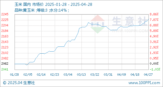 4月28日,生意社玉米基准价为2228.57元/吨,与本月初(2194.29元/吨)相比,上涨了1.56%。