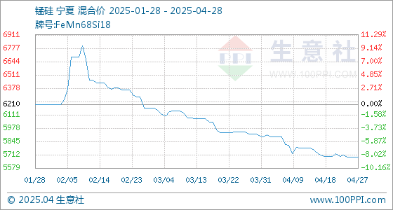 4月28日,生意社锰硅基准价为5690.00元/吨,与本月初(5900.00元/吨)相比,下降了-3.56%。