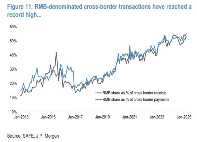 与其他国家相比,中国本土投资者以资金回流或美元兑换为形式的 “去美元化” 现象并不明显,但在过去几年里,人民币在国际贸易中逐渐取代美元的 “去美元化” 进程却更加显著。根据国家外汇管理局(SAFE)的最新数据,人民币计价的交易目前占跨境支付 / 收款总额的 55%/53%,均达到历史新高(图 11)。