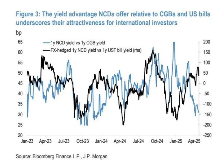 图 3:NCD 相对于中国国债和美国国债的收益率优势,凸显了其对国际投资者的吸引力(基点)