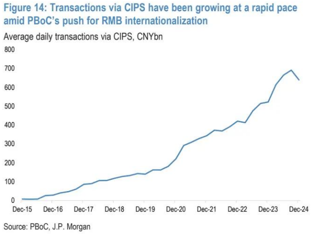 图 14:在中国人民银行推动人民币国际化的背景下,通过 CIPS 进行的交易增长迅速 CIPS 平均每日交易量(单位:10 亿元人民币)