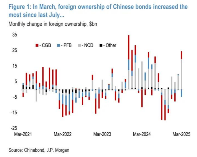 图 1:3 月,外国对中国债券的持有量自去年 7 月以来增长最为显著…… 外国持有量月度变化(单位:10 亿美元)