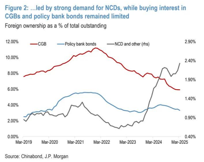图 2:对 NCD 的需求强劲,而对中国国债和政策性银行债券的购买兴趣仍然有限 外国持有量占未偿总额的百分比