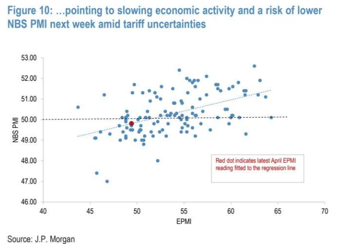 关税生效已近一个月,其对经济的损害可能比预期更快地在经济活动数据中显现。中国 4 月新兴产业采购经理人指数(EPMI)本月下降了 10.2 个百分点,降幅超过季节性水平(4 月为 49.4,3 月为 59.6),这是在关税不确定性下经济增长明显放缓的早期迹象。EPMI 与国家统计局 / 财新 PMI 类似,是一项基于调查的经济指标,主要关注中国的关键战略性新兴产业,包括绿色能源、生物技术、新能源汽车、新材料和高端制造业。EPMI 与国家统计局 PMI 之间的历史正相关关系,预示着下周发布的 PMI 数据存在不对称的下行风险。