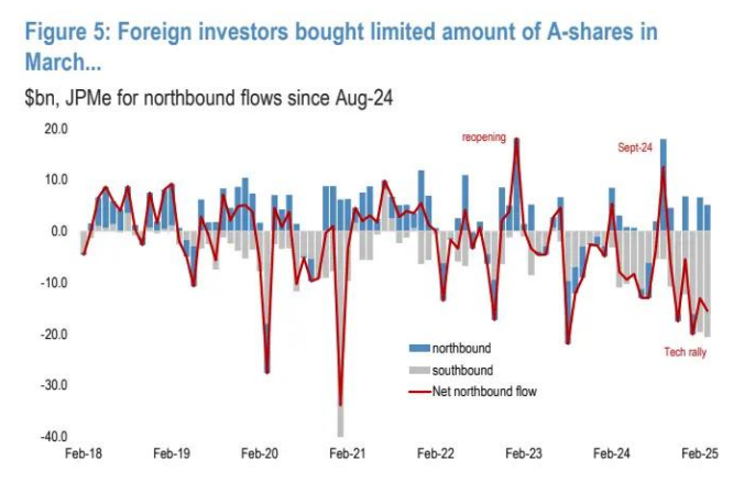 外国投资者在 3 月继续买入中国股票,但规模非常有限。我们对北向资金流入的估算显示,离岸投资者上月又增持了 50 亿美元的 A 股,2 月的增持额为 66 亿美元(图 5)。这与我们的股票策略师对 EPFR 资金流向的追踪结果一致,该结果显示,2 月和 3 月出现了资金净流入,但在解放日后,随着全球范围内的广泛去风险行动,4 月资金流入似乎出现了逆转。尽管外部压力不断增大,但中国政策制定者仍持观望态度,且至今尚未宣布任何增量刺激措施,这可能也抑制了投资者的买入兴趣。