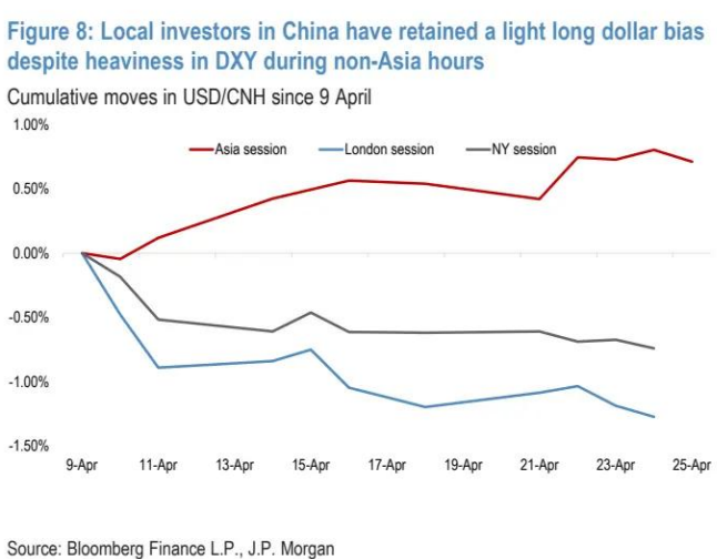 图 8:中国境内投资者在非亚洲交易时段美元指数走软的情况下,仍略微倾向于持有美元多头 自 4 月 9 日以来美元兑离岸人民币的累计走势
