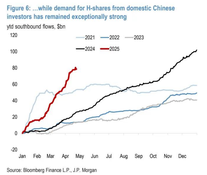 除增持中国债券外,外国投资者在 3 月也继续买入中国股票。据我们估算,上月北向资金流入约 50 亿美元,然而我们的股票策略师对 EPFR 资金流向的追踪显示,4 月资金流入可能已出现逆转。与此同时,中国境内投资者持续买入 H 股,年初至今南向资金流入达到创纪录的 780 亿美元,这一抢购热潮伴随着资金从美国股票市场的转出。国内合格境内机构投资者(QDII)基金的资产管理公司在其第一季度报告中普遍表示,降低了对美国股票的配置。