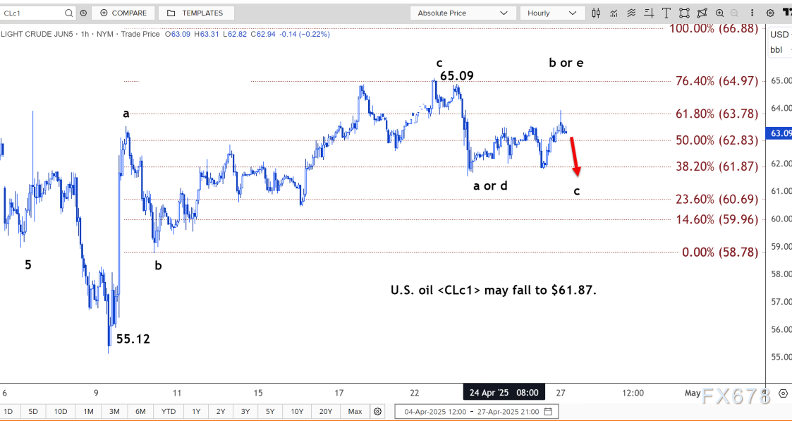 从 65.09 美元开始的下跌由三波组成。到目前为止,只出现了两浪。第三浪,即 c 浪,可能刚刚启动,正朝着 60.69 美元至 61.87 美元的区间行进。
