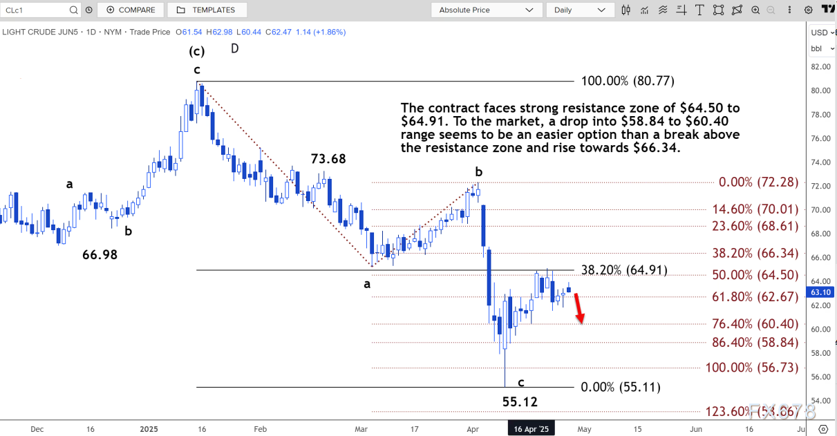 对于市场而言,跌至 58.84 美元至 60.40 美元区间似乎比突破阻力区并升至 66.34 美元更容易。