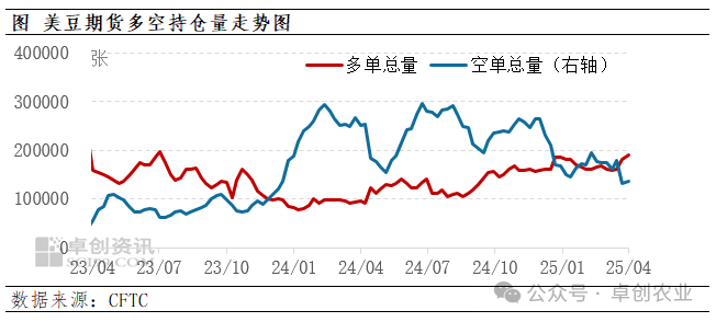 CFTC数据显示,截至4月24日,非商业持仓多单增持8711张至19.15万张,空单增持3188张至13.59万张。多单增持幅度大于空单,利多美豆期货价格。
