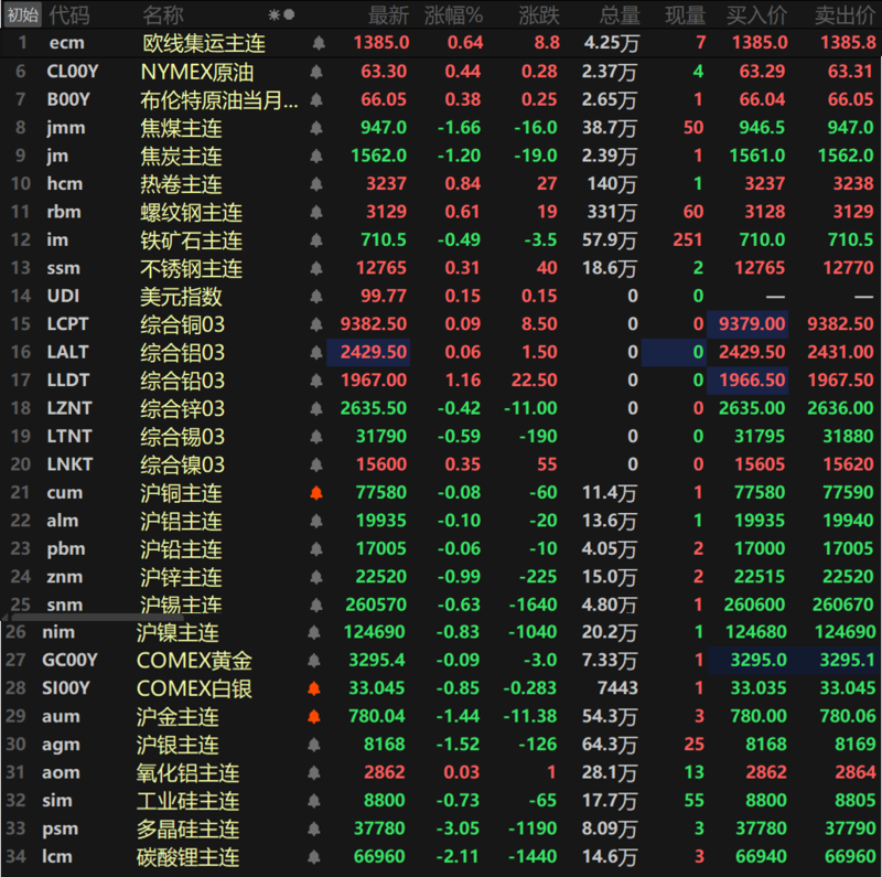 此外,碳酸锂主连跌2.11%,多晶硅主连跌3.05%,工业硅主连跌0.73%。欧线集运主连涨0.64%。