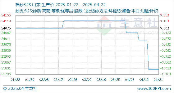 4月22日,生意社棉纱32S基准价为23825.00元/吨,与本月初(24125.00元/吨)相比,下降了-1.24%。