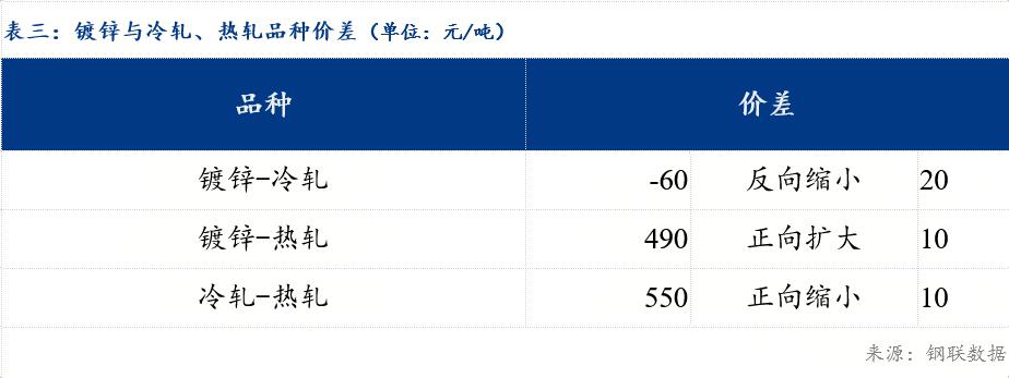 重庆、上海地区冷轧板卷区域价差维持不变,重庆、广州冷轧板卷区域价差缩小10元/吨;重庆、上海镀锌板卷区域价差维持不变,重庆、广州镀锌板卷区域价差维持不变。镀锌、冷轧品种价差反向缩小20元/吨;镀锌、热轧品种价差扩大10元/吨;冷轧、热轧品种价差缩小10元/吨。