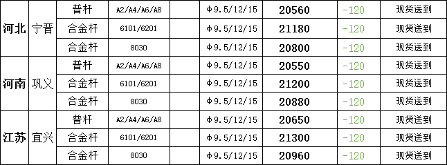 4月28日宁晋市场普铝杆现货报盘价20560元/吨,较上一交易日报价跌120元/吨;巩义市场普铝杆现货报盘价20550元/吨,较上一交易日报价跌120元/吨;宜兴市场普铝杆报盘价20650元/吨,较上一交易日报价跌120元/吨。