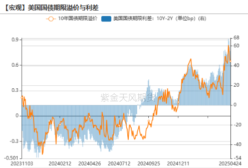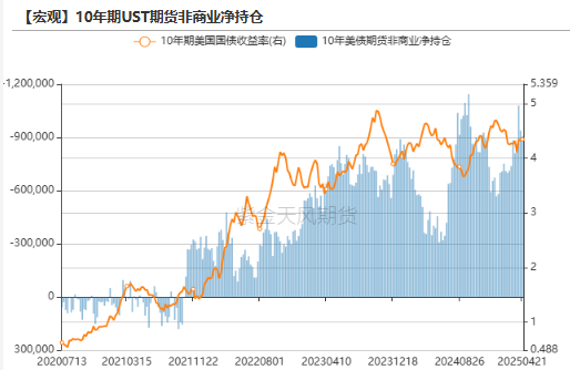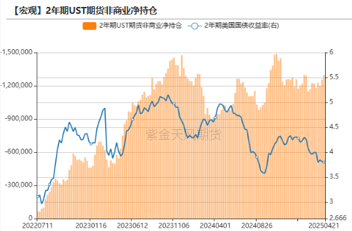 截至4.22的数据,长短端美债利率持仓分化,2年期UST期货非商业净持仓空头增加43222手至1297995手;10年期UST期货非商业净持仓空头减少31649手至906106手。