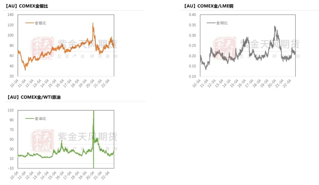 金银比震荡走低,主要因为上周黄金下跌、白银上涨;金铜比走低,主要因为上周黄金下跌、铜上涨;金油比环比走高,主要因为布油下跌幅度大于黄金。
