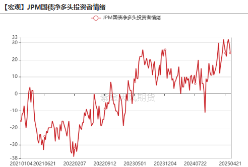 截至4.21当周,JPM国债净多头投资者情绪降至24,接近年内高位。