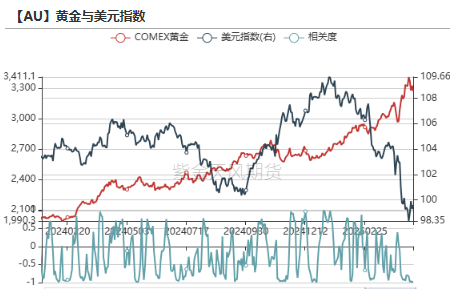 上周美元指数与黄金价格反向变动,黄金下跌0.24%,美元指数上行0.36%至99.58,两者滚动相关性上升。