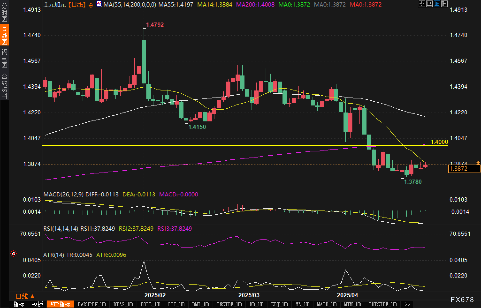 从美元兑加元的日线图来看,汇价近期呈现明显的下降趋势。价格已经跌破1.4000的关键心理关口,并在最近触及1.3780的低点。图表显示多条移动平均线呈现空头排列,其中14日均线已经向下穿越200日均线,形成"死叉"信号,这通常被视为下跌趋势确认的技术指标。