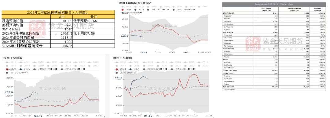 美国方面,USDA最新给出的3月种植意向报告中,种植面积为986.7万英亩,略高于NCC给出的意向报告,同比下降7.5%。