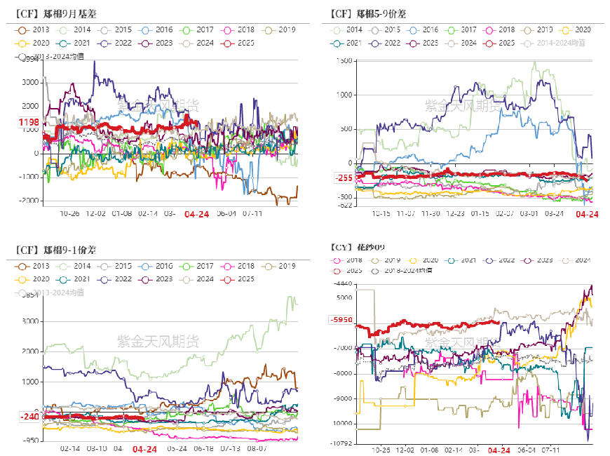 销售方面,2024/25南疆机采3129/29-30B/杂3内主流较低销售基差在CF09+750-800起,部分高报至900-1000起,疆内自提。基差稳中走强。