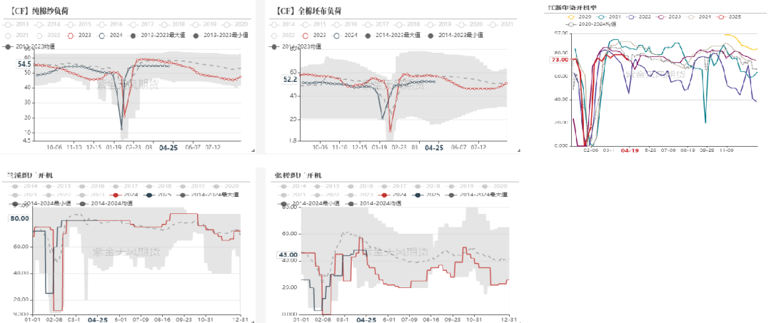 截至4月25日,棉纱厂开机负荷为54.5%,纺企开机维持,得益于纺纱利润修复。目前各地区织厂整体开机率在52.2%,开机平稳。