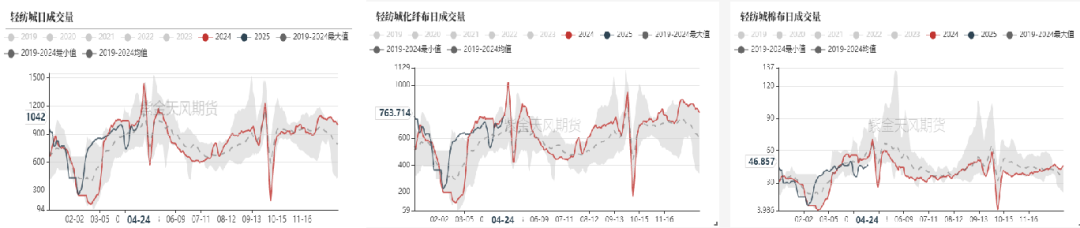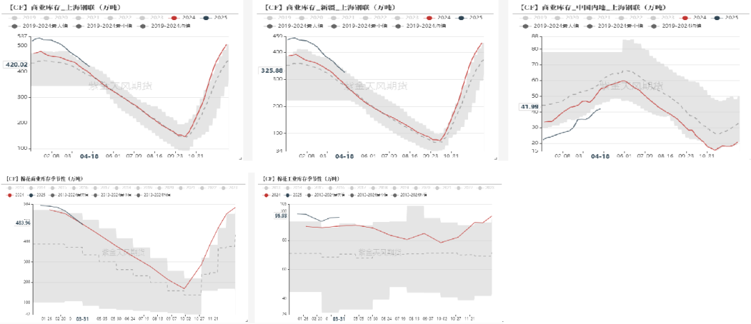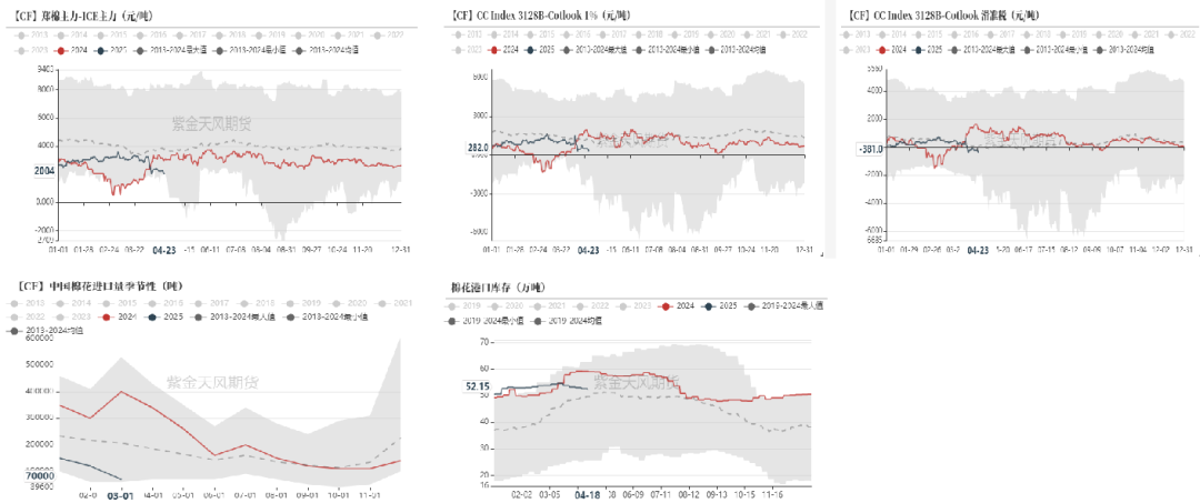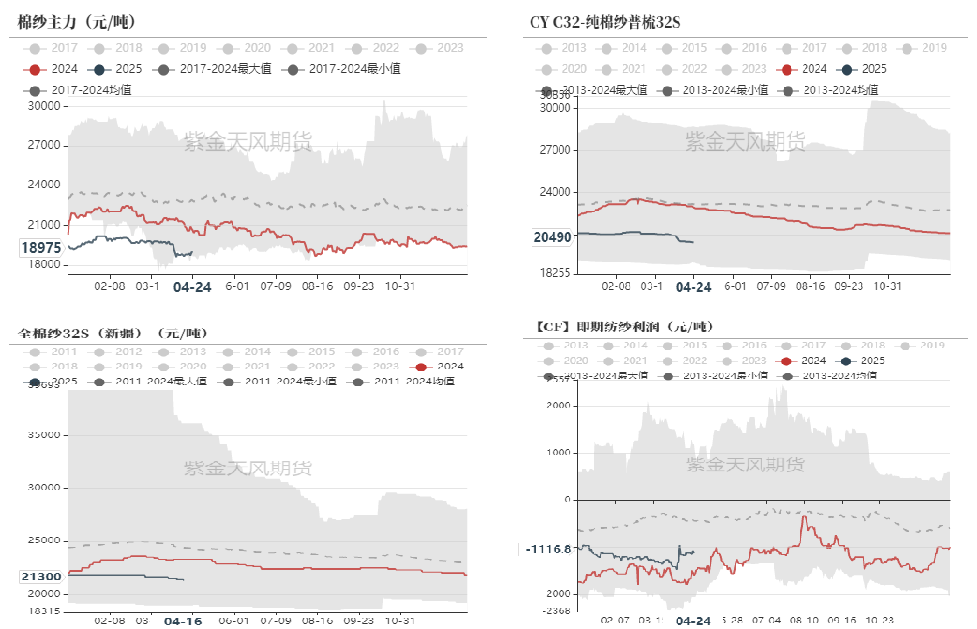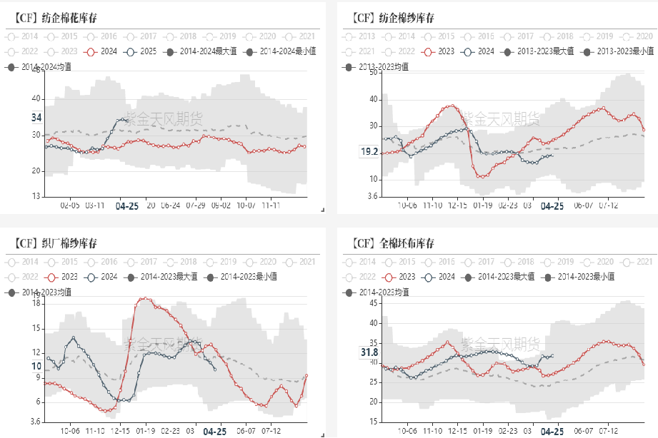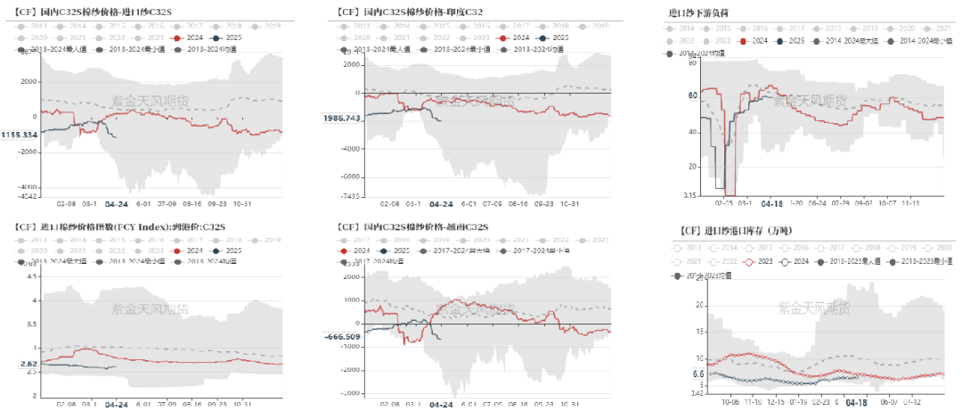 截至4月25日,纺纱厂原料库存为34天,补库放缓。成品库存19.2天,成品小幅累库。织布厂棉纱库存为10天,织布厂全棉坯布成品库存31.8天,成品小幅累库,下游可能提前进入淡季。
