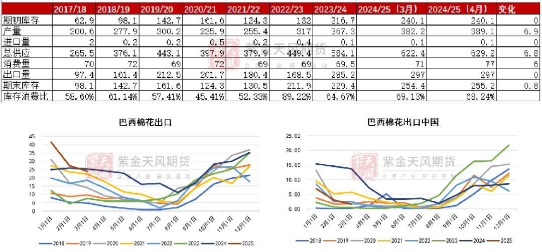 据巴西国家商品供应公司(CONAB)4月份发布的2024/25年度最新产量预测数据:本年度巴西棉花总产预期为389.1万吨,较上一月调增6.9万吨。本年度种植面积继续增加至207.93万公顷,单产上调至124.8公斤/亩。