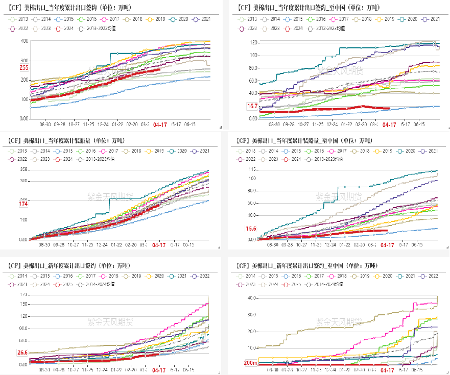 新年度种植预期:偏空 USDA4月报告中,2024/25年度全球棉花,产量、消费量和贸易量均有所下降,而库存量有所增加,整体影响偏空。美国方面,由于出口预期下滑,而期末库存增加,影响中性偏空。