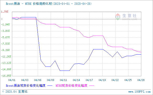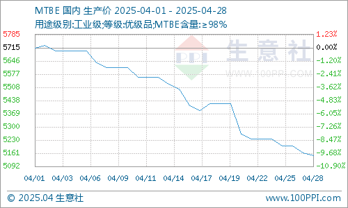据生意社商品行情分析系统,国内MTBE市场行情单边下行。4月1日至28日,MTBE价格自5715元/吨下跌至5150元/吨,周期内价格跌幅9.89%,价格同比下跌29.81%。