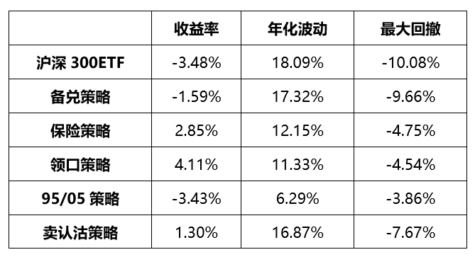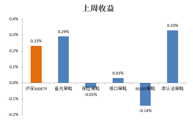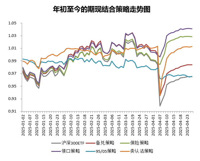 我们对期现结合的五个策略(备兑、保险、领口、95/05配置、卖认沽)及沪深300ETF现货,在上周(2025.4.21-2025.4.25)的表现进行了回测。上周沪深300ETF上涨,卖认沽策略表现较好。具体结果如下: