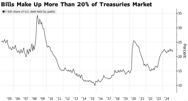 美国国库券供应在2024年总统大选期间成为一个引爆点,当时包括贝森特在内的共和党人指责耶伦遏制较长期债券的销售,以抑制关键的市场利率,并在11月大选前支持经济。短期票据占未偿债务的比例有所上升,超过了由投资者、交易商和其他市场参与者组成的财政部借款咨询委员会(TBAC)此前建议的15%至20%的区间。但TBAC和耶伦及其团队都对这些批评进行了反击。