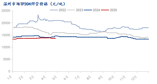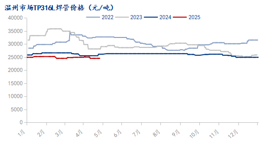 从价格表现来看,月初在原料价格波动以及市场对需求复苏预期的影响下,不锈钢焊管价格一度呈现出上扬的态势。然而随着时间的推移,市场的不确定性逐渐加剧,一方面,全球经济复苏步伐的缓慢,尤其是一些主要经济体的经济数据不及预期,导致市场对不锈钢焊管的需求信心受挫;另一方面,贸易摩擦的阴影始终笼罩,关税政策的变化使得出口市场的难度加大,进一步打压了市场对价格的乐观情绪,叠加关联品种价格的不断走跌,市场看空情绪浓厚,焊管价格支撑不足开始下调,跌幅在100-500元/吨。下旬开始不锈钢期货盘面红绿交替,市场整体情绪仍旧偏谨慎,部分厂家出货压力较大,有小幅补跌的操作,跌幅在200-300元/吨,多数价格开始企稳,等待行情转好。