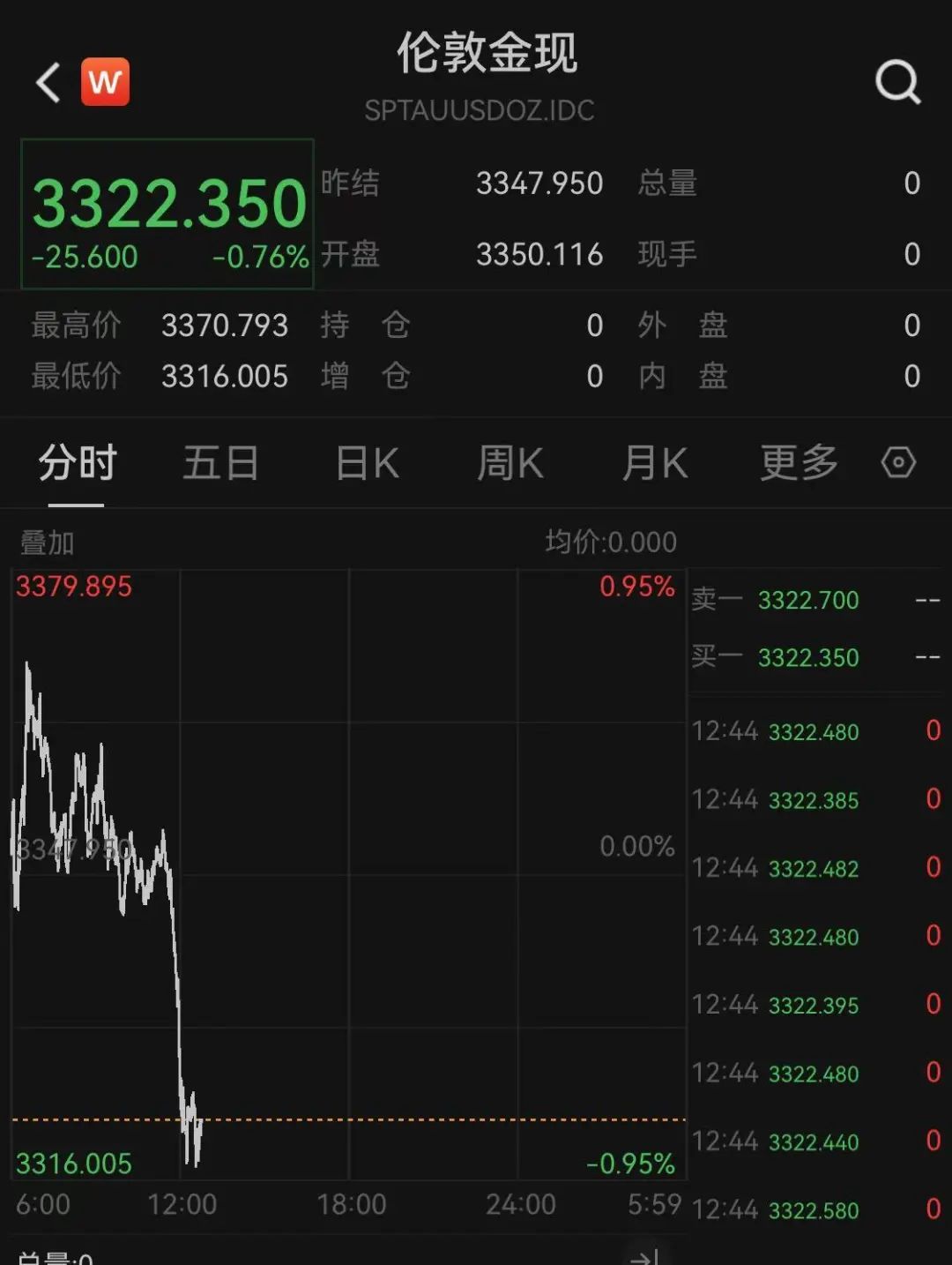 午后,现货黄金突然大跳水,从涨超0.8%直线下跌,截至发稿跌近0.8%,一度回落至3320美元下方。
