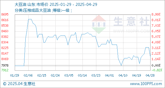 4月29日,生意社大豆油基准价为8106.00元/吨,与本月初(8342.00元/吨)相比,下降了-2.83%。