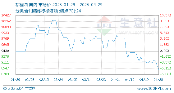 4月29日,生意社棕榈油基准价为8920.00元/吨,与本月初(9700.00元/吨)相比,下降了-8.04%。