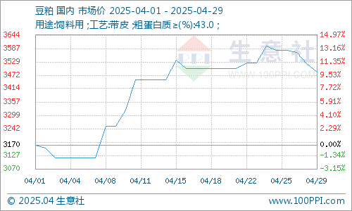 据生意社商品行情分析系统显示,4月豆粕行情振荡上涨,涨幅超11%。4月1日,豆粕市场均价3170元/吨,4月28日,豆粕市场均价3523元/吨,上涨11.15%。