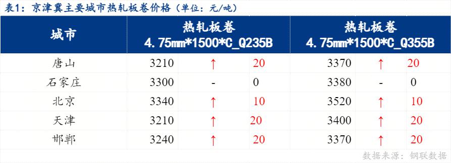 京津冀地区热轧板卷价格稳中上行,其中唐山较上一交易日上涨20元/吨、北京较上一交易日上涨10元/吨 、石家庄较上一交易日稳 、天津较上一交易日上涨20元/吨 、邯郸较上一交易日上涨20元/吨 。