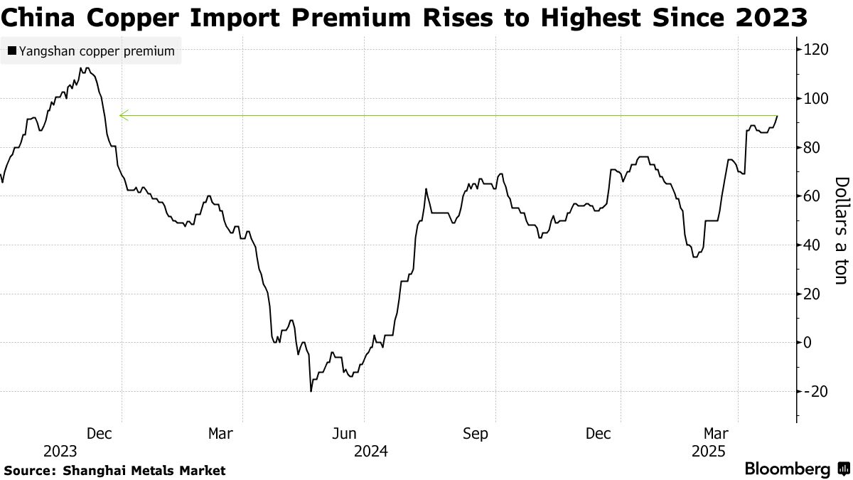 随着买家争相确保供应,衡量中国铜市场需求强弱的一项指标跃升至2023年末以来的最高水平。根据研究机构上海金属市场的数据,洋山铜溢价从2月底的每吨35美元低点跃升至周一的每吨93美元。