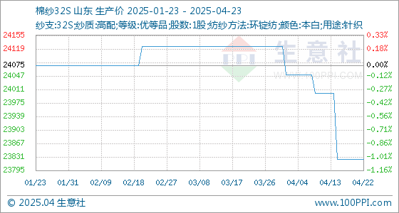 4月23日,生意社棉纱32S基准价为23825.00元/吨,与本月初(24125.00元/吨)相比,下降了-1.24%。