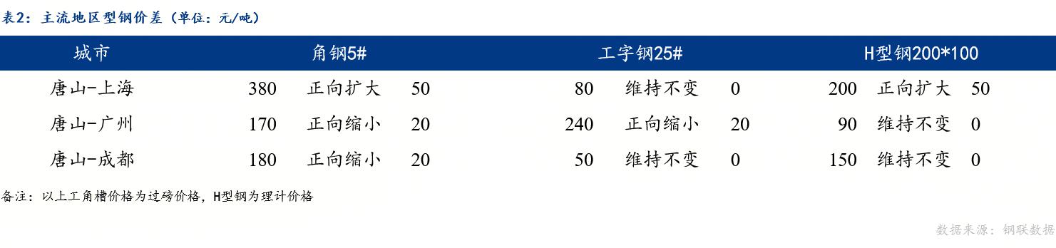 今日唐山角钢H型钢与上海角钢H型钢价差正向扩大;唐山角钢工字钢与广州角钢工字钢价差正向缩小。
