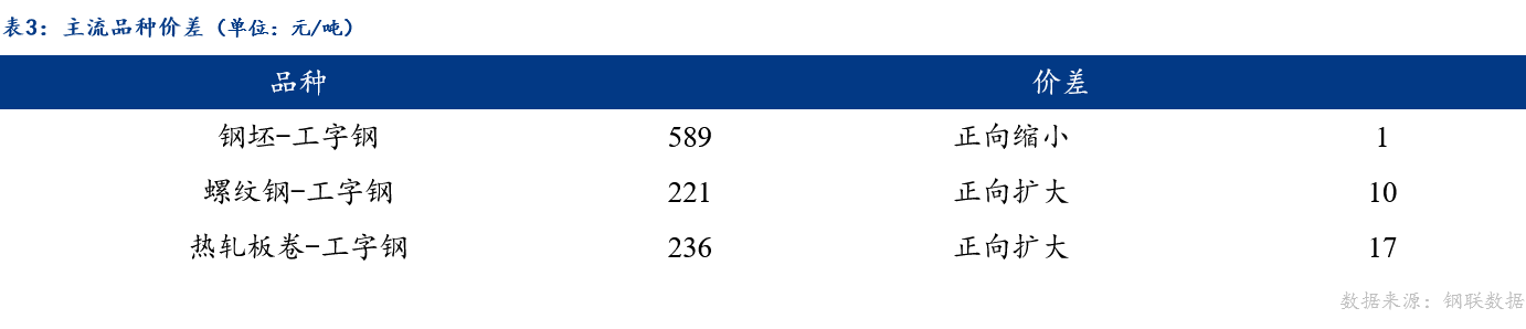 今日工字钢与钢坯价差正向缩小,与螺纹钢热轧板卷价差正向扩大。
