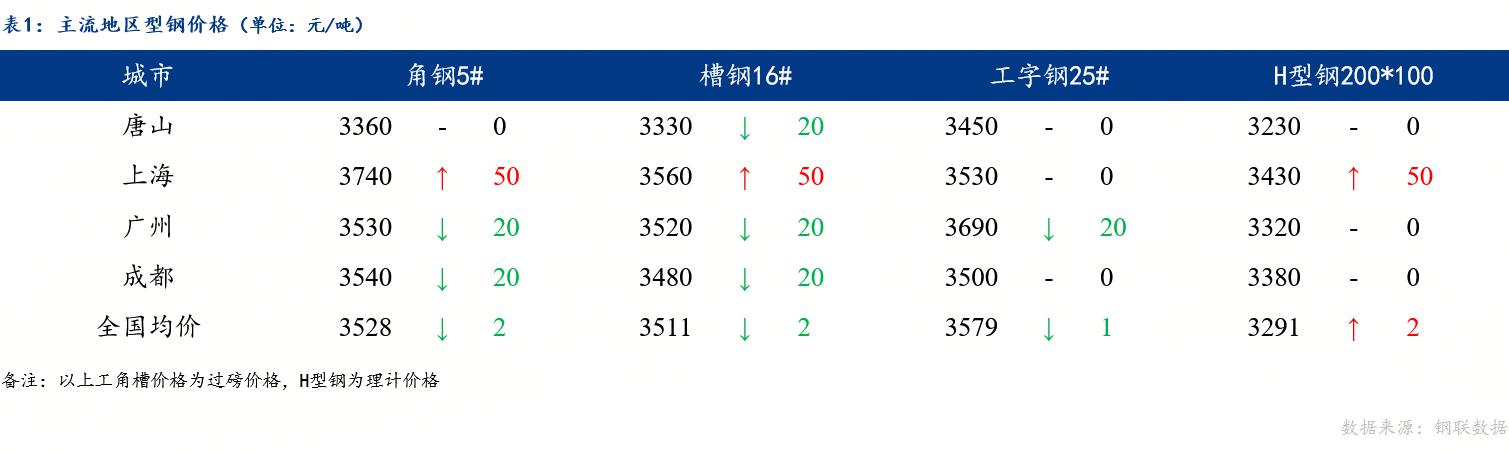 今日上海工字钢角钢槽钢H型钢价格较上一交易日上涨50元/吨;其余市场稳中趋弱运行为主。
