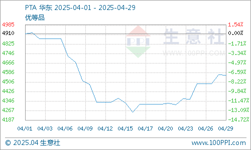 PTA跟随原油价格波动,4月呈现先跌后涨“V”型走势。截止4月28日华东地区PTA市场均价在4565元/吨,较月初下跌7.03%。供应方面4-6月,PTA计划检修装置较多,现货流通逐步收紧,其中嘉通能源200万吨/年的PTA装置,恒力惠州2#250万吨装置均于4月底按计划检修,目前行业开工率在76%左右。另外,新增产能方面,虹港石化3#250万吨装置计划6月中旬投产。