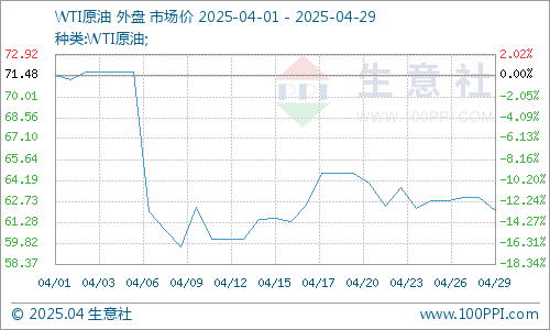 国际原油市场4月份受关税贸易影响,波动比较明显。月初贸易摩擦升级,导致原油价格大幅走跌,中旬开始随着市场对美国关税新政的担忧情绪有所缓解,尤其是美国在贸易战中对中国表现出更为缓和的态度,国际原油价格窄幅上涨。4月28日,美国WTI原油期货主力合约结算价报62.05美元/桶,布伦特原油期货主力合约结算价报65.86美元/桶。