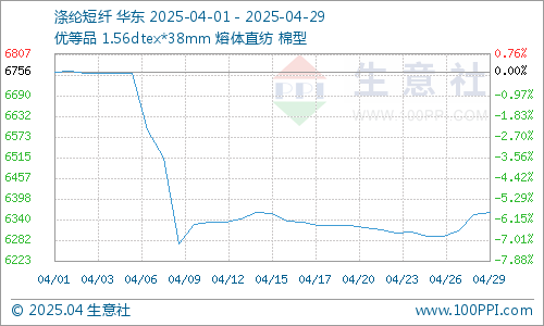据生意社商品行情分析系统,4月份国内涤纶短纤市场行情整体呈现弱势,月初下跌明显,随后止跌企稳,截止4月29日,国内涤纶短纤(1.4D*38mm)市场均价在6359元/吨,较月初下跌5.87%。