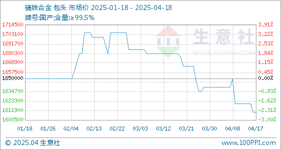 4月18日,生意社镝铁合金基准价为1610000.00元/吨,与本月初(1640000.00元/吨)相比,下降了-1.83%。